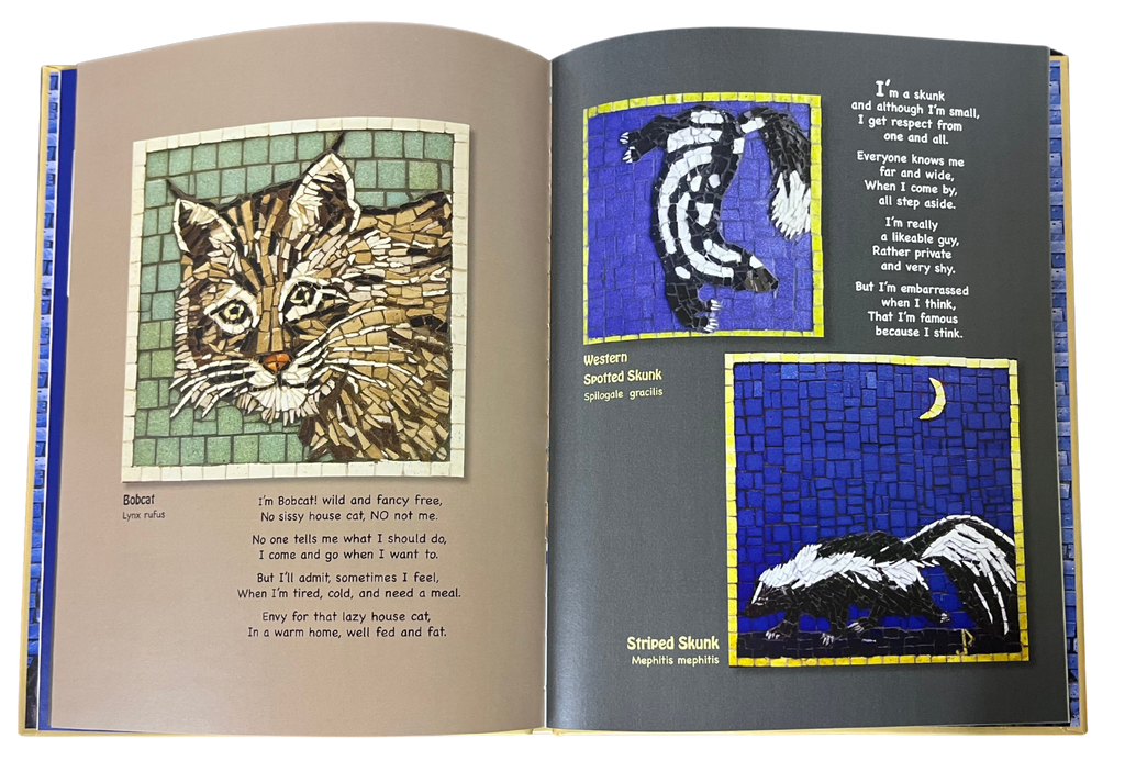 This book features California Nature Art Museum's founder, Patti Jacquemain and her incredible tile mosaics of wild animals, accompanied by a verse she has written for each.